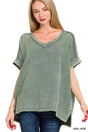 Zenana Acid Washed Double Gauze V-Neck Tee - ASH JADE / S